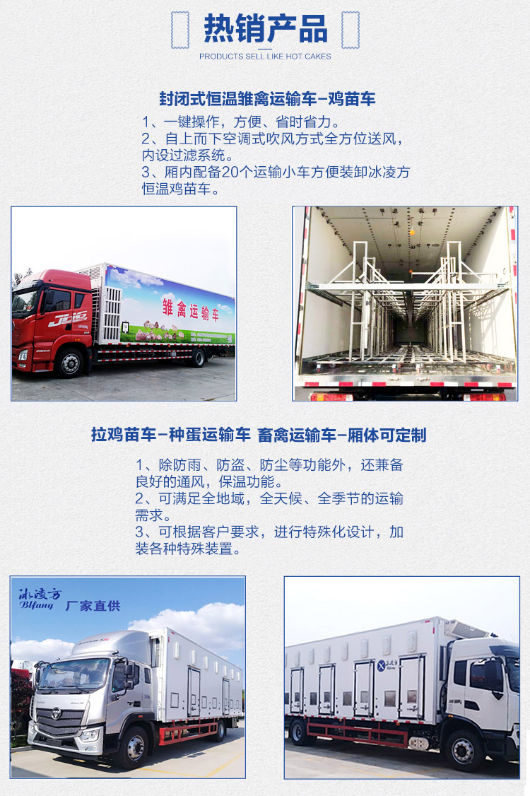 該車多元化的配置,除具備普通廂式車防雨、防盜、防塵等功能外,還兼備良好的通風,保溫功能,可滿足各家禽養殖企業全地域、全天候、全季節的運輸需求