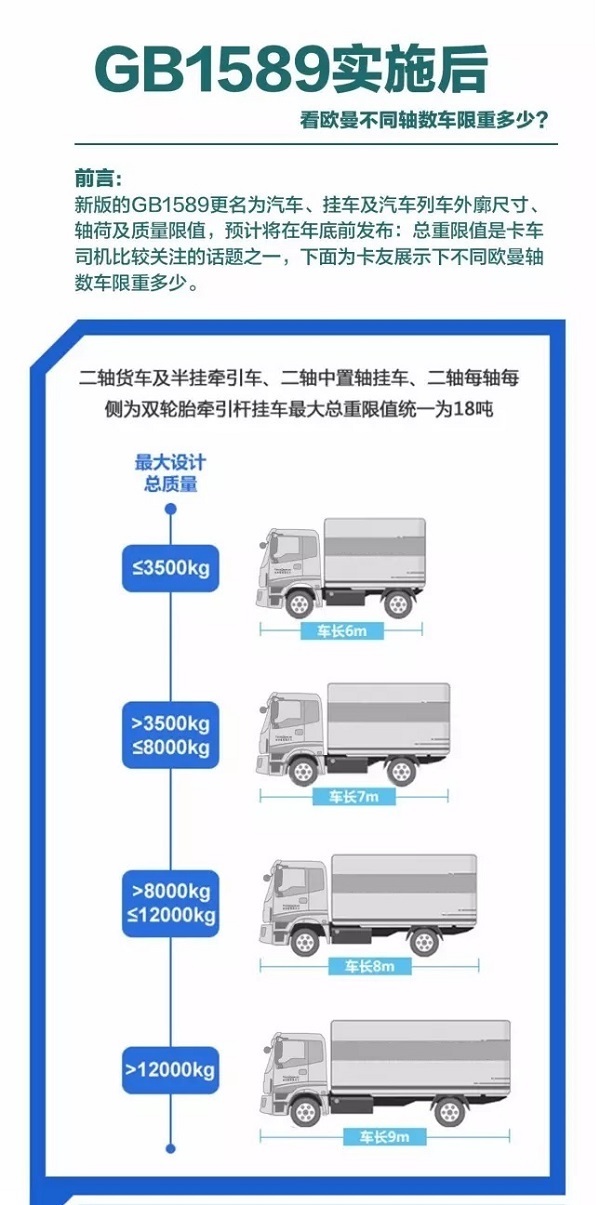 新版的GB1589更名為汽車、掛車及汽車列車外廊尺寸、軸荷及質量限值,預計將在年底前發(fā)布:總重限值是卡車司機比較關注的話題之一,下面為卡友展示一下不同歐曼軸數(shù)車限重多少。